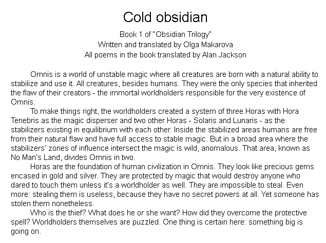 "Cold Obsidian" is a fantasy novel about a young mortal who becomes an apprentice of the creators of his world.