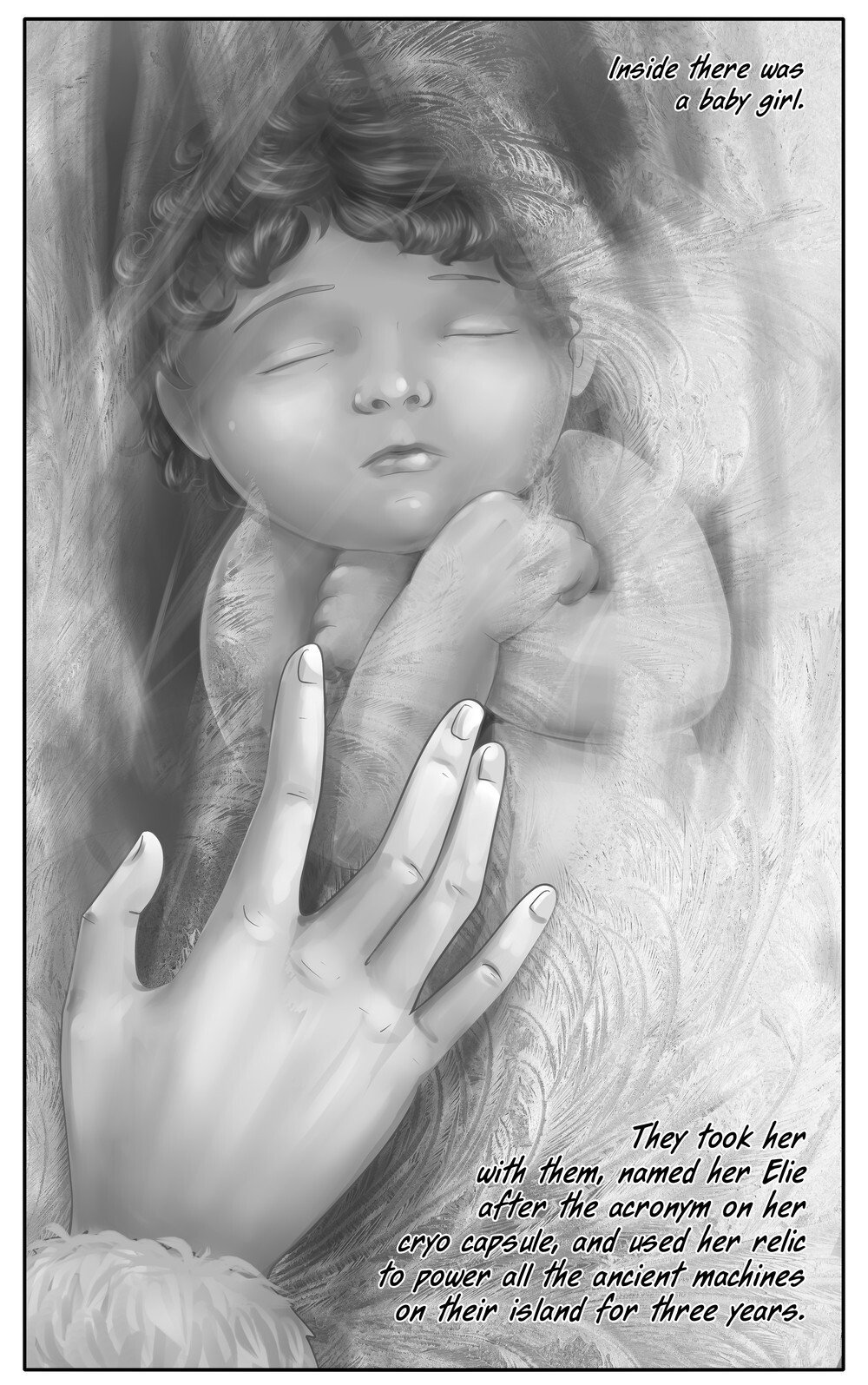 A group of cave dwellers and hunters enters the uncharted ice caves in search of ancient relics. They do find one: powering a little cryo capsule with a sleeping baby in it.